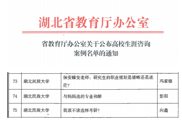 7月9日,湖北省高校生涯咨询案例评选结果揭晓,36365线路检测登录入口研究生处冯家银老师申报的《保安蝶变老师:研究生的职业规划是清晰还是迷茫?》,研究生处向鑫老师申报的《我该不该选择考研?》,法学院彭阳老师申报的《与妈妈选的专业和解》等3个案例成功入选。